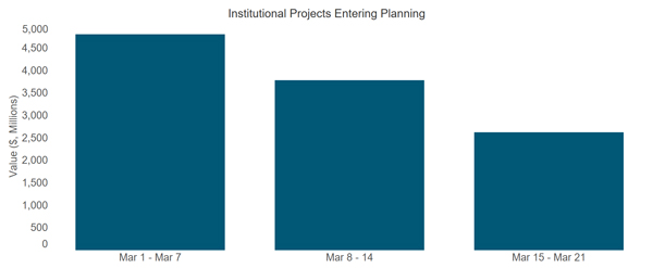 Initial planning projects in the commercial building sector have seemingly held up during the first week of major economic impact (Mar 15-Mar 21). A growing number of people are working remotely, so it seems plausible that remote access has provided private firms with greater flexibility. Heading into the crisis, the economy was also on solid footing with strong hiring and real estate fundamentals (such as vacancy rates and rents). This should insulate — at least in the short term — the commercial sector’s ability to initiate the planning process by entering projects into the construction pipeline. In fact, the dollar value of commercial projects entering planning during the first three weeks of March compared to the same period of February shows little to no difference. From a regional perspective, however, commercial planning in the Midwest and West appears to have pulled back, while activity in the South seemed particularly strong last week. Regional definitions are shown here: https://www2.census.gov/geo/pdfs/maps-data/maps/reference/us_regdiv.pdf).